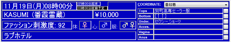 これを見ると分かるとおり、基本的には淫欲少女抄本編と大差はない。ただし、1つだけ決定的に異なっている部分がある。それは、社会評価のパラメータが無くなった代わりに、「体」「心」「服」という3つの性別表記が存在することである。そう……。この3つの性別表記こそが、天災あさおんが持つ性転換ゲームとしての特質を示していると言える。