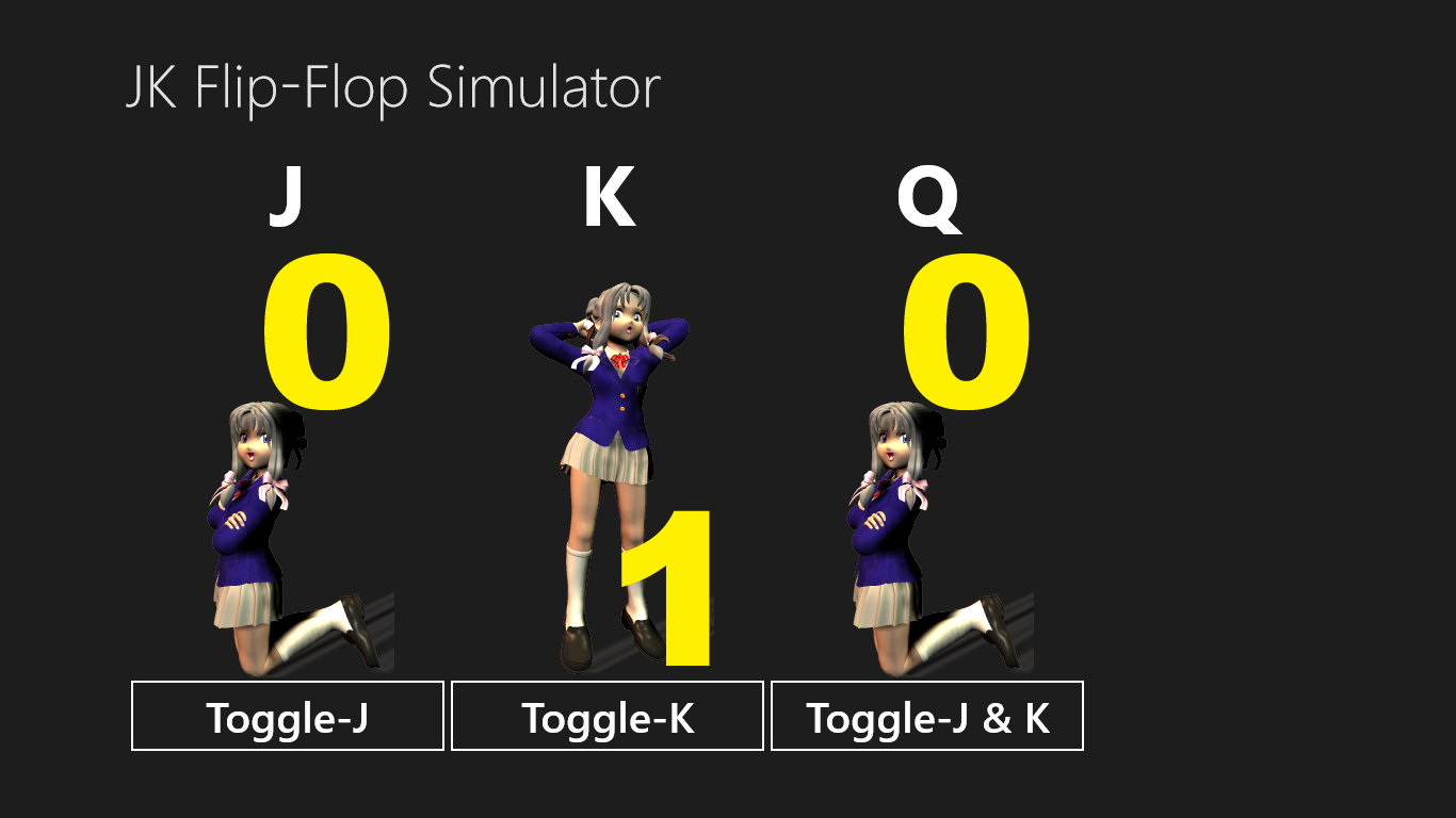 3つのボタンは、Jのみ反転。Kのみ反転。JとKをまとめて反転の3機能を持っていて、QはJとKとそれまでのQの状態で変化します。つまり、Qは自由になりません。上手く操作してJKQを全て1にして、いつもと違うビジュアルを見てみよう。